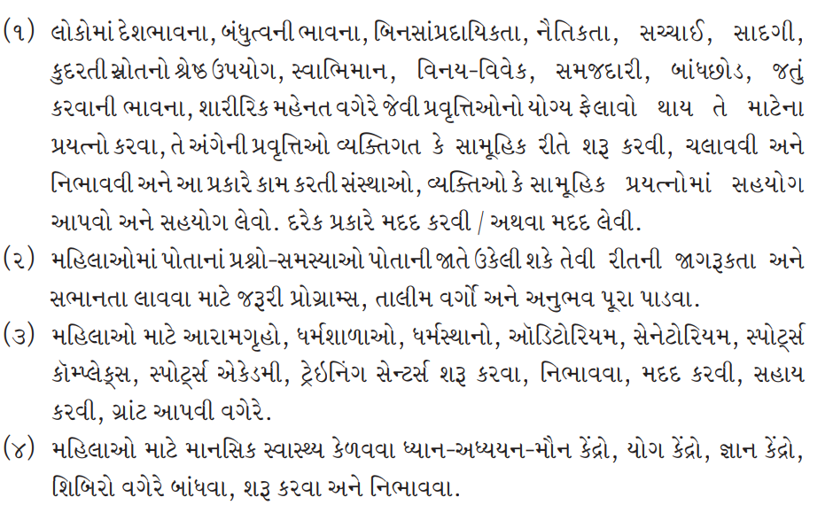 (1) To promote virtues such as patriotism, brotherhood, secularism, morality, truthfulness, simplicity, best use of natural resources, self-respect, modesty, discretion, forgiveness, physical exertion, etc. To start, run and sustain such activities individually or collectively; to collaborate with organizations or individuals working in this way. Helping and / or seeking help in every way.
