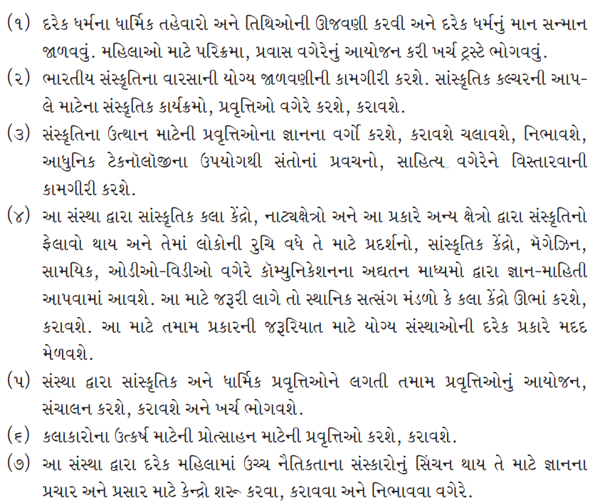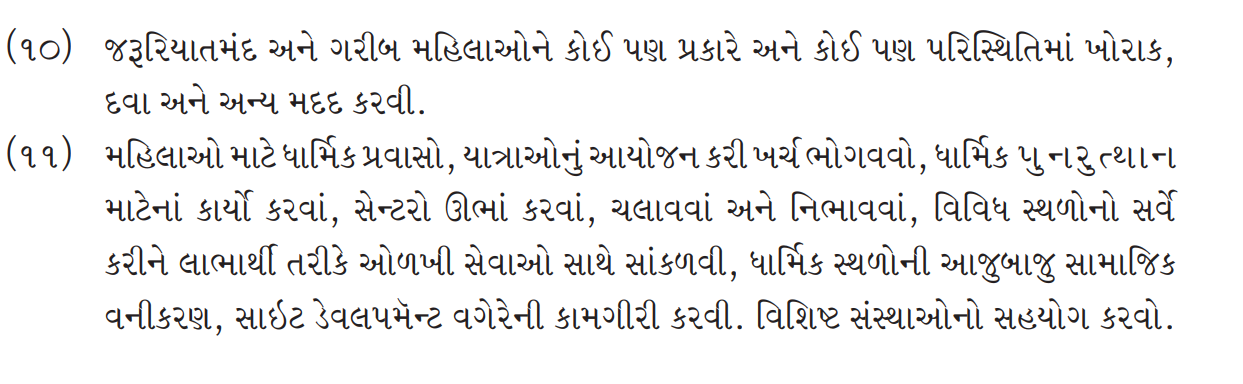 (1) Celebrating the religious festivals and dates of each religion and maintaining respect for each religion. Expenditure to be borne by the trust by organizing pilgrimage (parikrama), tours etc. for women