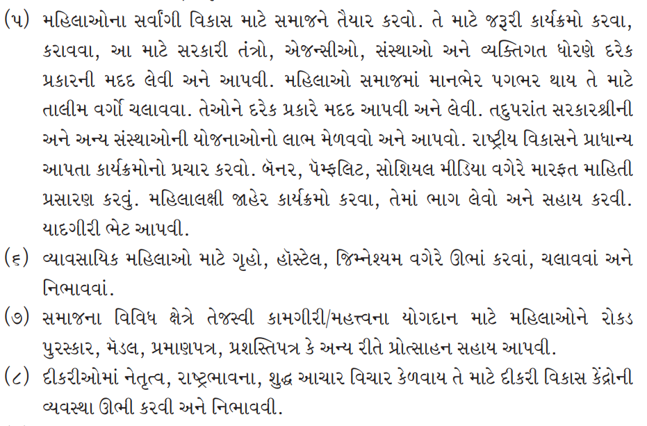 (5) To prepare society for the holistic development of women. To carry out programs required for that. For this, seek and give all kinds of help from/to government agencies, institutions and on an individual basis. Conduct training classes for women so that they become self-reliant with dignity in the society. Helping them and seeking their help in every way. In addition, to avail and extend the benefit of schemes of the Government and other institutions. Promoting programs that prioritize national development. Disseminating information through banners, pamphlets, social media etc. Conducting, participating in and assisting women-oriented public events. To give souvenir gifts.