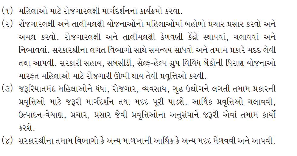 (2) To widely disseminate and implement employment oriented and training oriented schemes among women. To establish, run and maintain employment oriented and training oriented training centers. Coordinate with the concerned departments of the Government and seek and give help in all possible ways. Carrying out employment generating activities for women through government assistance, subsidies, self-help groups, lending schemes of various banks.