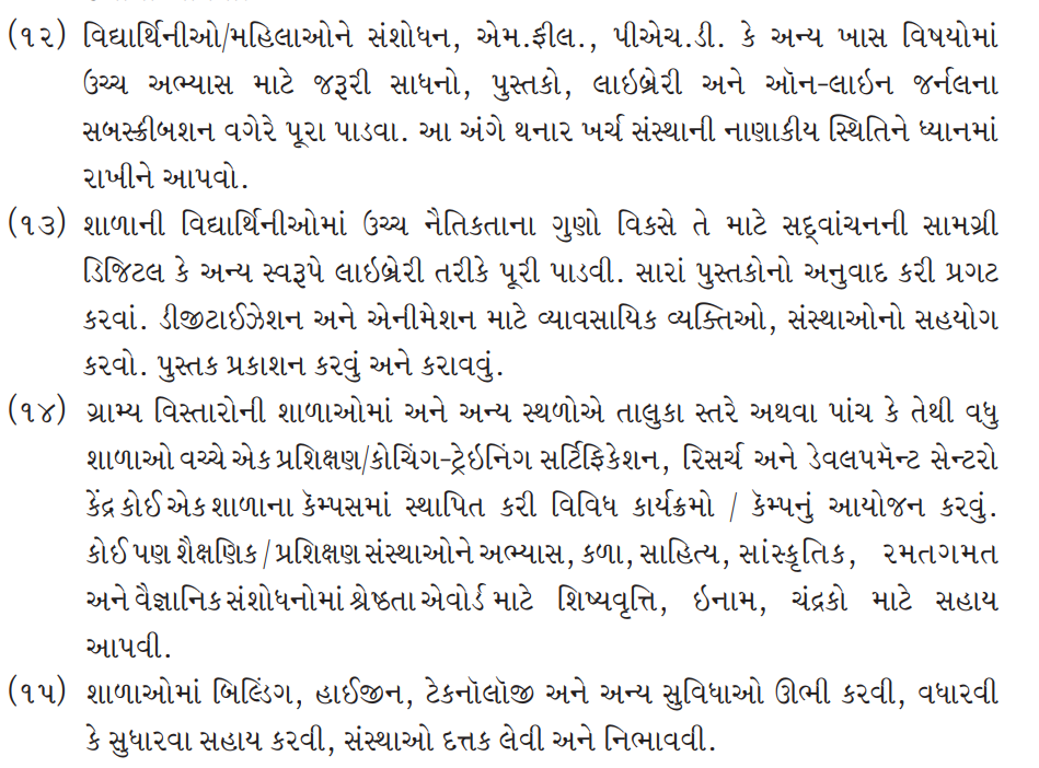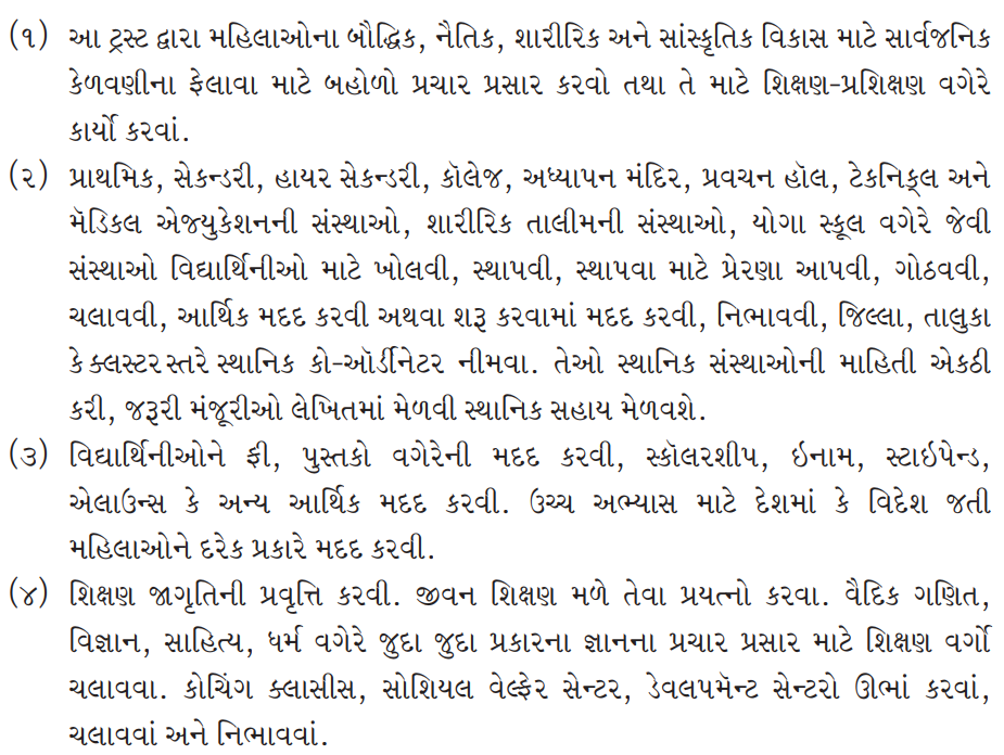 (2) To open, establish, to inspire to open, organize, run institutions for girl students like primary, secondary, higher secondary, college, adhyapan mandir, lecture hall, institutes of technical and medical education, institutes of physical training, yoga school etc. Help financially and / or help start, sustain. To appoint local coordinators at district, taluka or cluster level. They will collect information from local institutions, get the necessary approvals in writing and get local assistance.