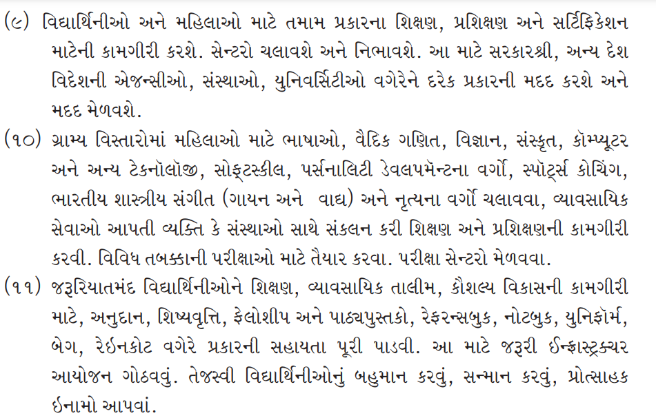 (11) Provide grants for education, vocational training, skills development work, scholarships, fellowships and textbooks, reference books, notebooks, uniforms, bags, raincoats etc. to needy girl students. Plan and implement necessary infrastructure for this. To honor and give incentive prizes to brilliant girl students.