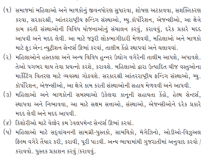 (1) To improve the living standards of women and children in the society, to prevent exploitation, to empower them, to run various schemes of government, international funding organizations, municipal corporations, agencies, organizations working in this field. Helping and seeking help in every way. Getting the necessary public participation for this. To set up food and nutrition centers for women and children. Establish and operate training centers.